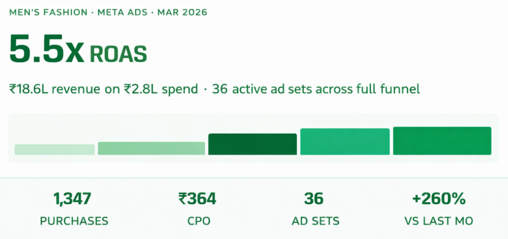 We’ve scaled 200+ D2C brands on Meta – from ₹5L to ₹50L/month. Clothing, footwear, accessories, pickles, perfumes, soap and much more.